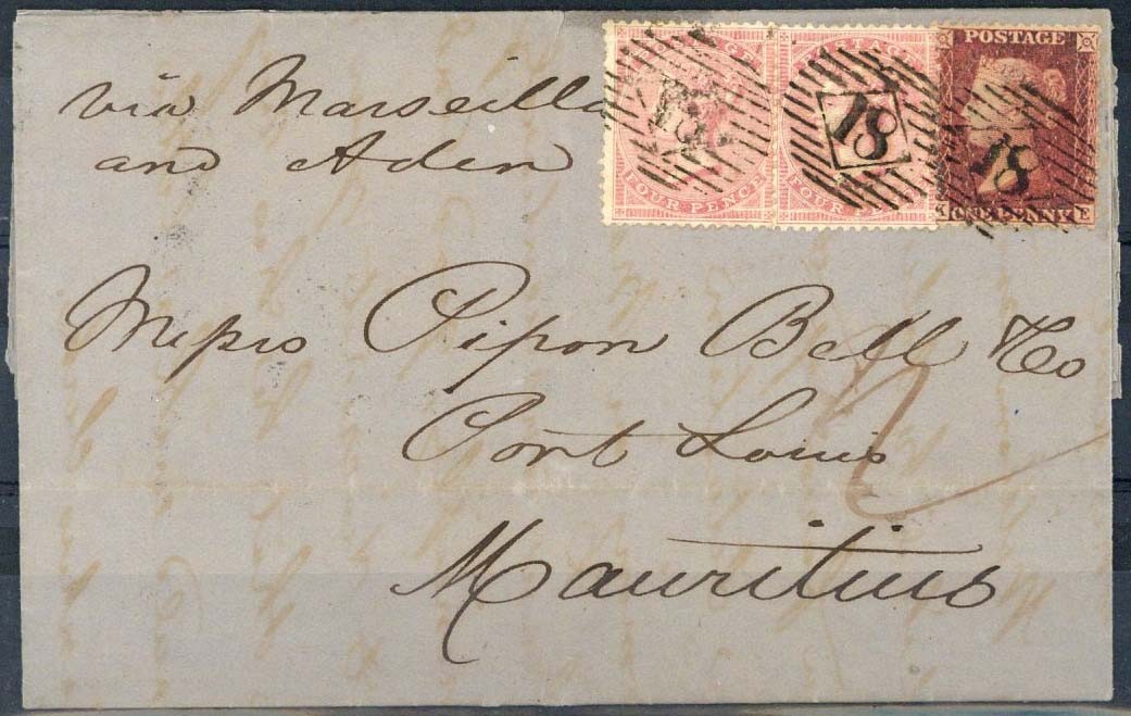 1859 (17 Oct.) fragile entire letter, endorsed Via Marseille and Aden, addressed to Port Louis Mauritius, franked 1855-57 watermark large Garter 4d. (2) and 1d. 'stars' with London "18" cancellations, arrival c.d.s. (17 Nov.) on reverse; some splits along the folds and other slight faults, scarce