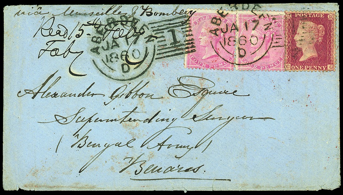 4d. rose carmine (2) used with 1d. Stars on envelope (with long enclosure), dated 17 Jan. 1860, addressed to Alexander Gibbon Esquire Superintending Surgeon Bengal Army Benares, Aberdeen "1" duplex cancellations, transit and arrival markings on reverse, fine. Photo