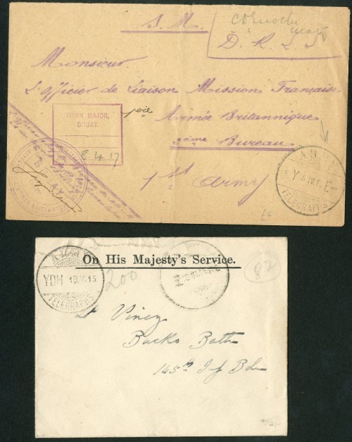 1913-22 collection of Military mail, seventy-one covers or cards contained in a black "Concertina" binder, including much from the Dardanelles Campaign, largely stampless and showing a range of British Army and Field Post Office single and double-ring datestamps including D54, DY, NL1, SWY2, SX2, SX3, SX4, SX5, SX8, SX11, SZ5 and W2, Indian Army Telegraph datestamps with codes MW, YD and YDH, Indian F.P.O. 409 (2), 1912 envelope with Salonika Greek P.O. intaglio seal Arms h.s., British Army Post Office at Constantinople d.s. (8, two registered), French Tresor et Postes 505 cover apparently recovered from mail torpedoed in the Mediterranean, one from Pera to a P.O.W. at Alexandria, censor marks throughout. An interesting lot