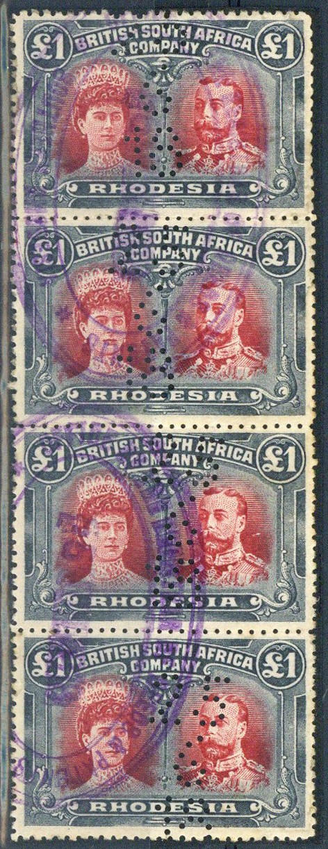 £1 rose-scarlet and bluish black, a vertical strip of four fiscally used with dated perfins and Deeds and Patents oval datestamps in violet