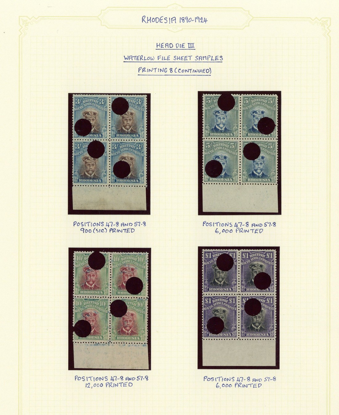 A collection of the reference file sheet stamps neatly mounted and written-up on pages, all plated and in blocks of four, unless otherwise stated, and nearly all marginal, comprising Printing 1 ½d., 4d., 5d., 6d., 2/-, 2/6d., 5/-, 7/6d. and 10/-; 2 1d. (2), 3d., 2/- and 3/-; 3 ½d.; 7 ½d. (block of six), 1d., 1½d., 2d., 3d., 4d., 5d., 6d., 8d., 10d. (2), 1/-, 2/-, 2/6d. and 5/-; 8 ½d., 1d., 2d., 2½d., 3d., 4d., 5d., 6d., 1/-, 2/-, 2/6d., 3/-, 5/-, 10/- and £1; 9 1/-; 10 5d. , 5/- and 10/-, all three with additional imprint blocks of eight, 11 3d., 4d., 5d., 6d., 10d., 1/-, 2/- and £1; 12 4d. with additional imprint block of eight, 8d. and £1; 13 ½d., 1d., 1½d. (2), 2d., 4d., 6d., 8d., 10d., 1/-, 2/-, 2/6d., 3/-, 5/- and £1 (2); and 14 ½d., 2d., 3d., 4d., 6d., 1/-, 2/-, 2/6d., 3/-, 5/- and 10/-; various size security puncture holes and with the normal soiling in places, however a generally attractive and comprehensive collection of these interesting stamps. (382)