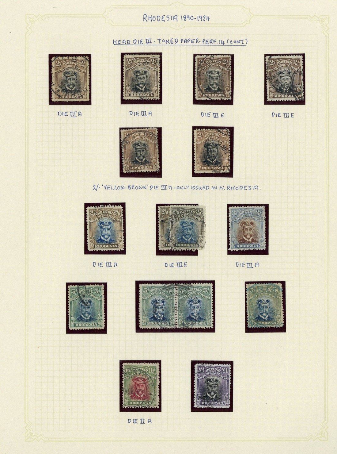 Perf. 14 used range with shades, comprising 2d. (16 with a pair, two Die IIIA), 3d. (9 with a strip of four), 4d. (8 with a strip of three and a pair), 5d. (6 with two pairs), 6d. (9 with a pair), 8d. (6 with a pair, two Die IIIA), 10d. (2), 1/- (13 with a strip of four and a pair), 2/- (6, two yellow-brown with Northern Rhodesia datestamps), 2/6d. (3), 3/-, 5/- (4 with a pair, one with Umtali c.d.s. in blue), 10/- and £1; a few small faults in places and the £1 with cancellation not guaranteed though a generally attractive group