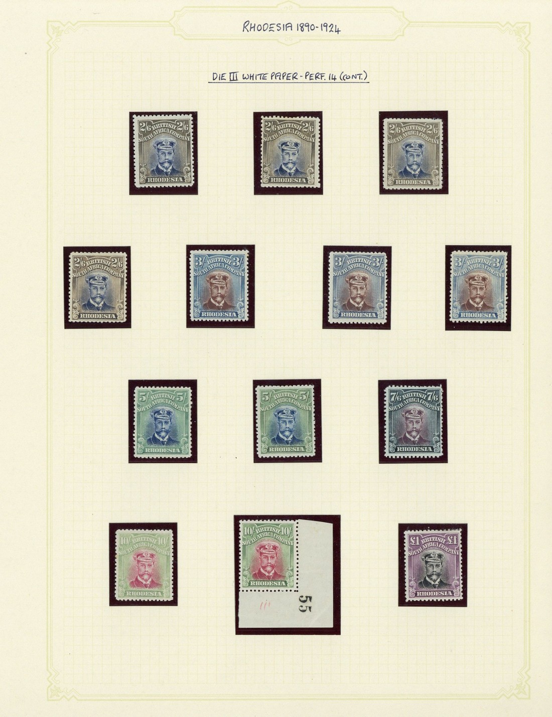 2d. (2), 3d., 4d., 6d., 8d. (3), 10d. (2), 1/- (2), 2/-, 2/6d. (4), 3/- (3), 5/- (2), 7/6d., 10/- (2, one from corner of sheet with sheet number "55") and £1, shades; good to fine mint