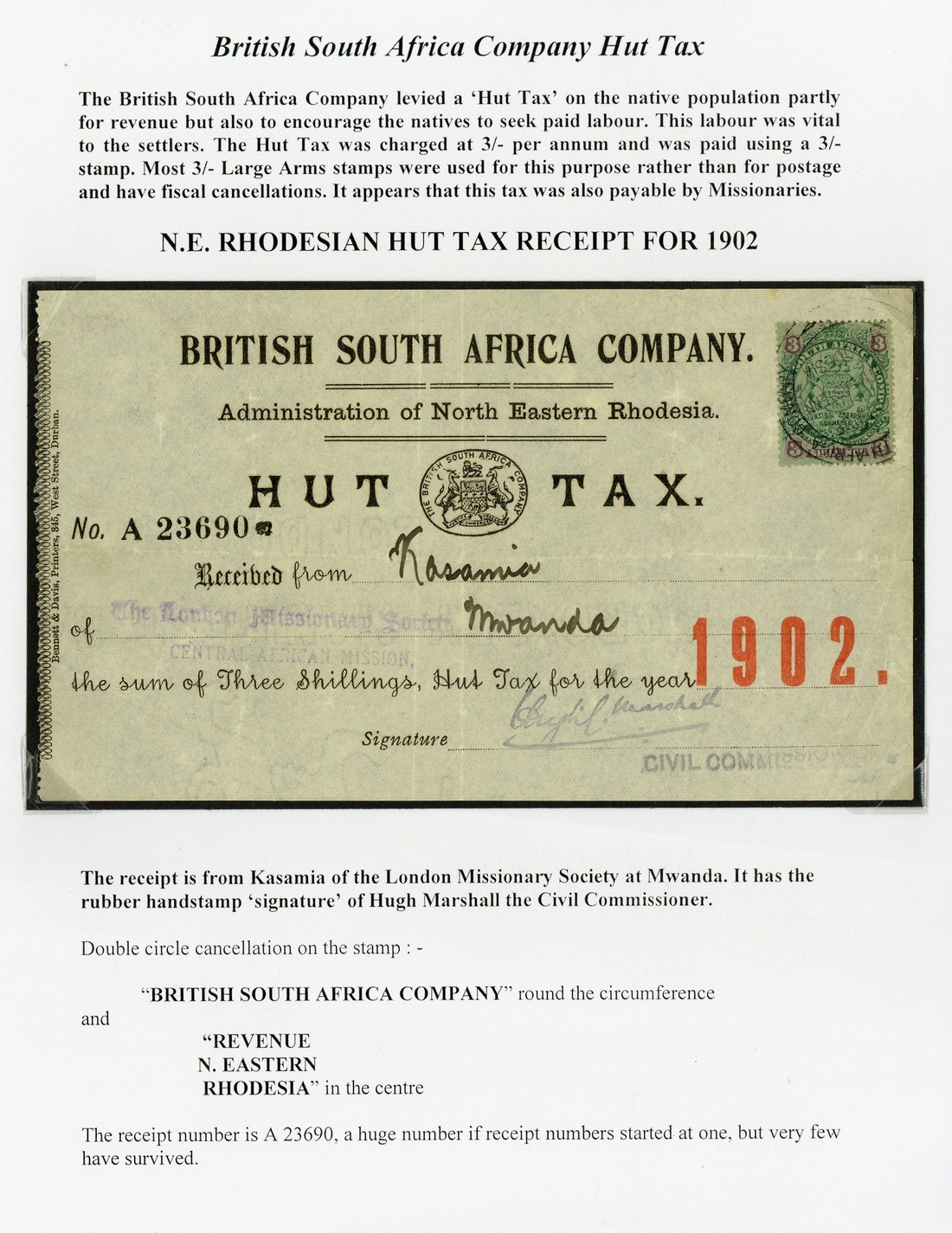 1900 Special Power of Attorney from Bulawayo bearing 1896 1/-, 1902 North Eastern Rhodesia Hut Tax receipt from Kasamia bearing 1896 3/-, 1904 Prospecting License from Gwelo bearing 1901 £1, 1913 Inspection Certificate from Gwelo bearing 1898 10/-, 1912 Insolvent Estate typed form from Salisbury bearing 1909 2/- on 5/- (3) and 1910-13 1/- and 2/- (5), 1920 Quitrent Receipt bearing Admiral 7/6d. and 1923 Deeds of Transfer from Bulawayo bearing Admiral 5/-, 10/- and £1; the first damaged in one corner though an attractive group