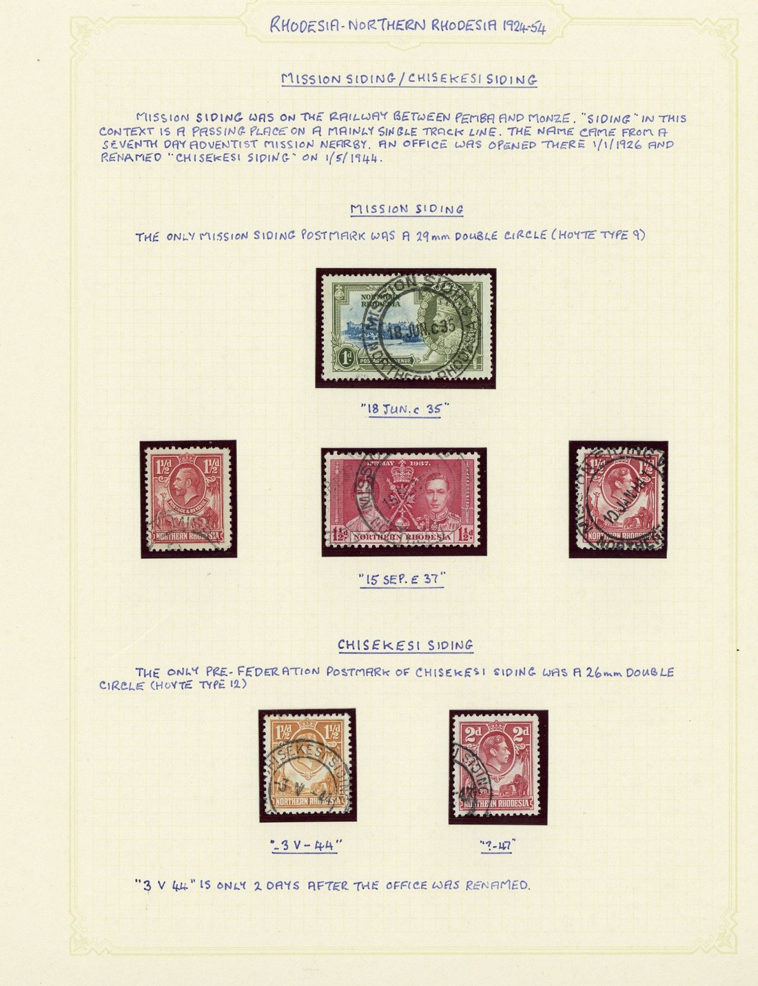 A collection of Northern, Southern, and Rhodesia and Nyasaland postmarks on loose stamps and pieces, arranged in a springback album and three stockbooks, the album including postcards from Turk Mine (1930) and Trelawney (1932); mostly untidely arranged though viewing may prove beneficial. (hundreds)
