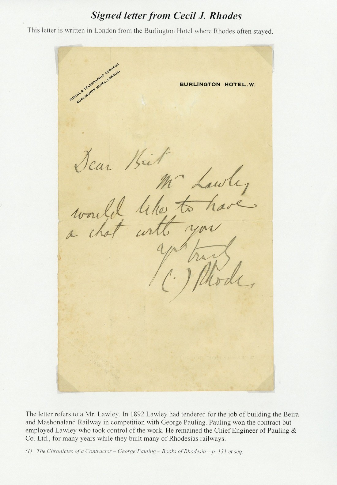 1895-99 selection bearing First Arms values, comprising undated front with six values to 6d., 1895 envelope to Salisbury bearing 2d., envelope to Stellenbosch bearing 8d., envelope to Johannesburg bearing 4d. and 1d. card, uprated with 1d., to England, all from Bulawayo, 1895 envelope to England bearing 6d. with indistinct "bar" cancellation, 1896 front from Bulawayo to England bearing 1d., 3d. and on Cape 2d. and 1899 4d. registered envelope, uprated with 6d., from Kopje to Cape Town; condition mixed in places. Also undated letter on Burlington House paper signed "C.J. Rhodes"