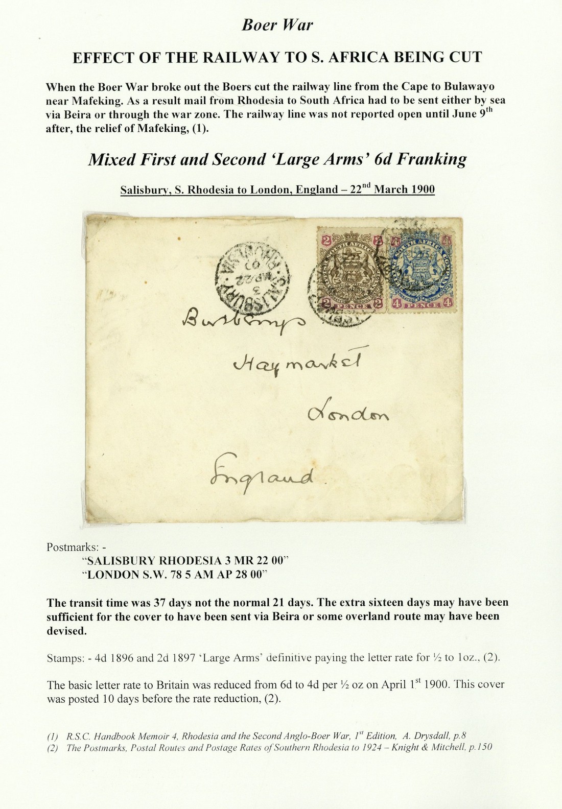 1900-02 Boer War civilian mail selection of covers (6) with 1900 (2) ex the same correspondence from Seymour, Cape to Bulawayo franked at 4d., 1900 from Bulawayo to Gaberones with "passed/press censor" handstamp, 1900 envelope from Salisbury franked at 6d., 1901 from G.B. to Belingwe and redirected to Bulawayo showing framed "non reclame./no claimed." handstamp and 1901 from Bulawayo to Vryburg with arrival Press Censor handstamp; also two Boer War picture postcards used in 1907 from Umtali to U.K.