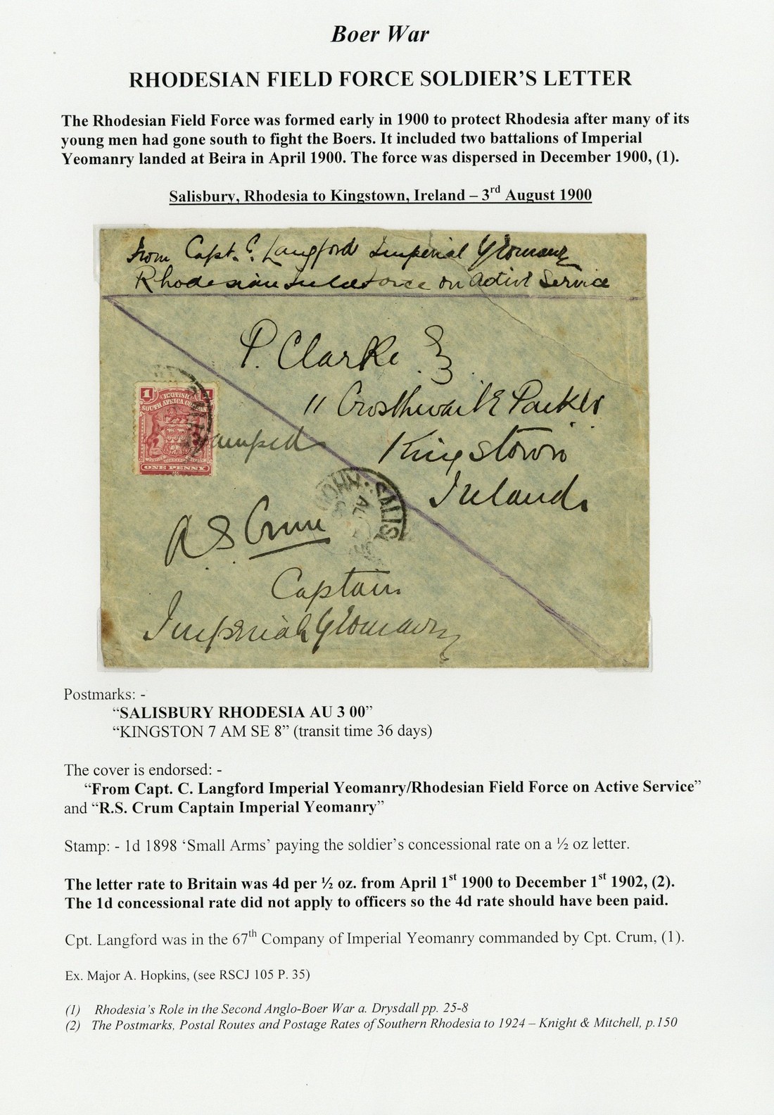 1900 soldier's envelopes from Marandellas and Salisbury to U.K. bearing 1d., and 1901 soldier's envelope from a member of the Cameron Scouts at Bulawayo to Melbourne bearing ½d. pair; a few faults though a scarce trio