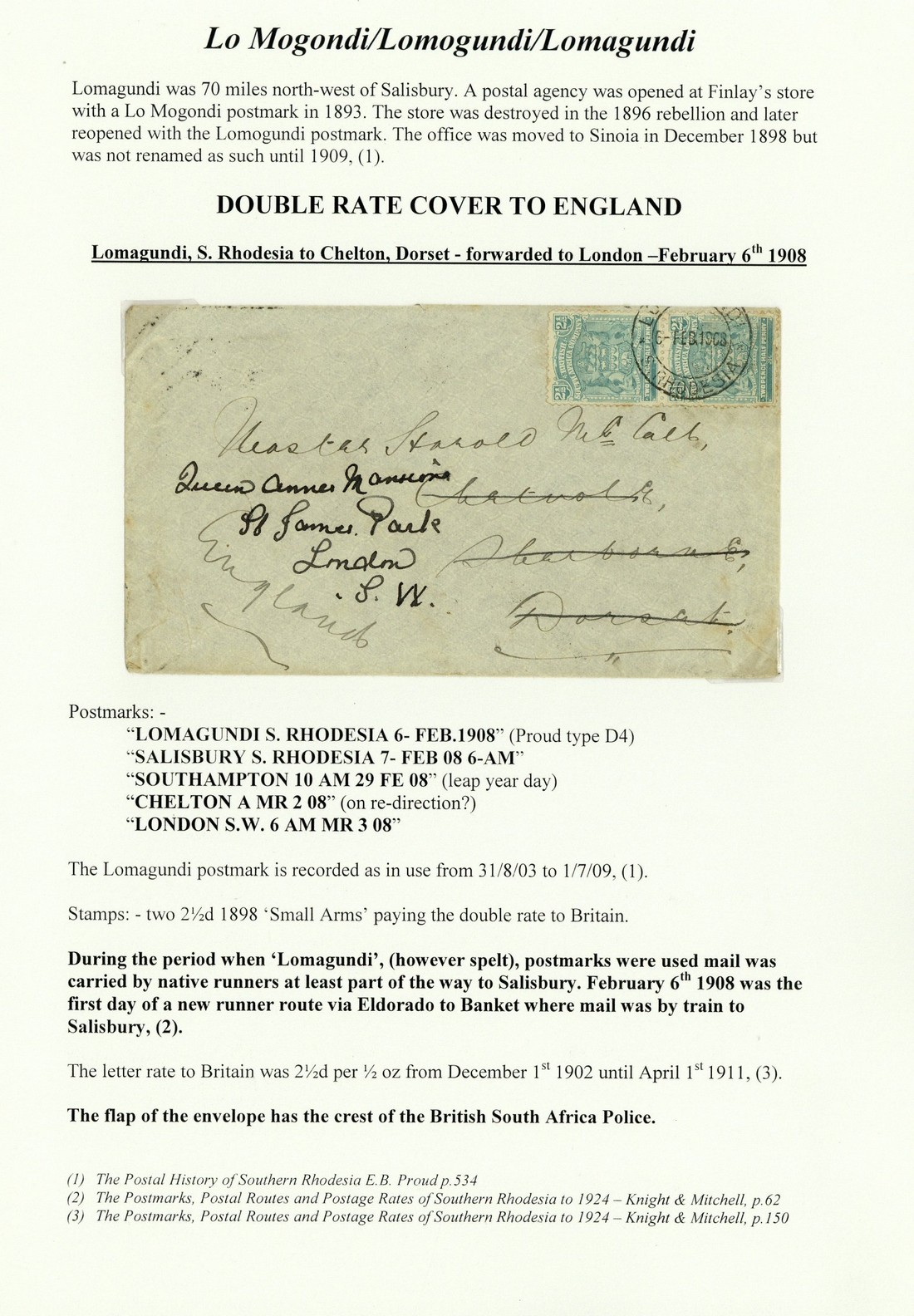 1905-22 selection of covers (17) selected for places of origin, the majority internal or to the U.K. including Arcturus, Battlefields Mine to Austria (additional stamp removed), Bindura, Bulawayo Station (3), Eiffel Flatts, Golden Valley, Lomagundi (also three loose stamps with cancels of this office), Marandellas, Matopos (incoming from U.K.), Mazoe, Melsetter to Germany, Old Umtali to Belgian Congo, Penhalonga, Plumtree and West Nicholson; generally good to fine