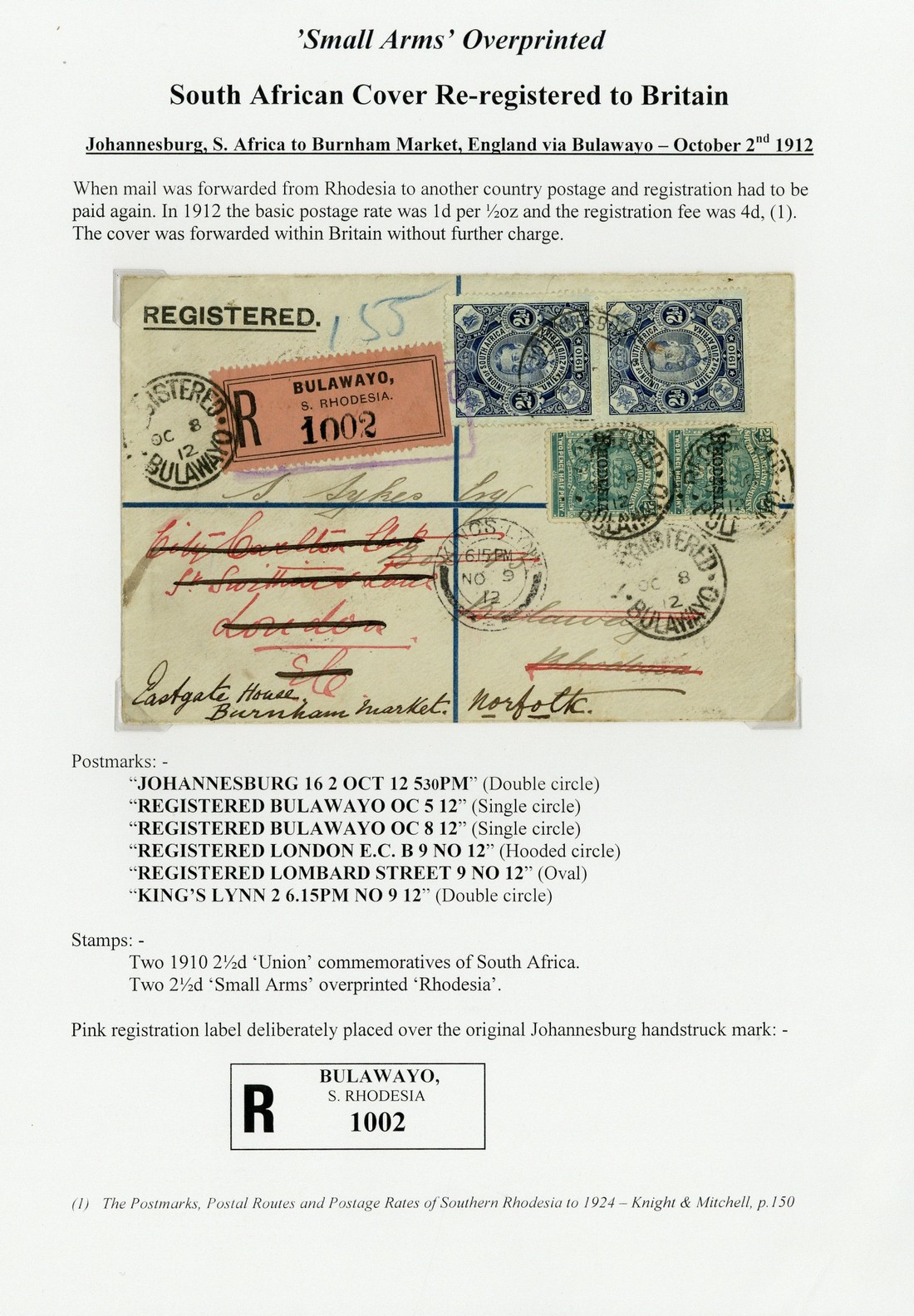 1909-12 selection of covers (7) bearing 1909 values including 1909 and 1912 registered from Bulawayo at 11½d. and 5d. respectively, the latter re-registered after originating in Johannesburg, 1909 registered from Salisbury to Germany bearing 2/6d. and 1910 registered from Penhalonga to London bearing 10d. on 3/- (defective) showing manuscript "Penhalonga 2412" and 1911 card franked at 1d. to New Zealand and redirected locally