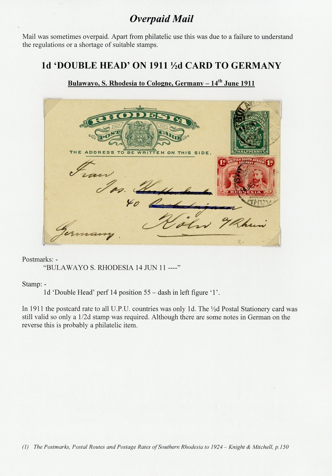 1910-12 picture postcards to U.K. (7) each bearing Double Head 1d., some plated including [53], [55], [75] "od" flaw and [88], one from Matopos, 1911 Arms ½d. card, uprated with Double Head 1d., to Germany and 1913 picture postcards to South Africa both bearing ½d.