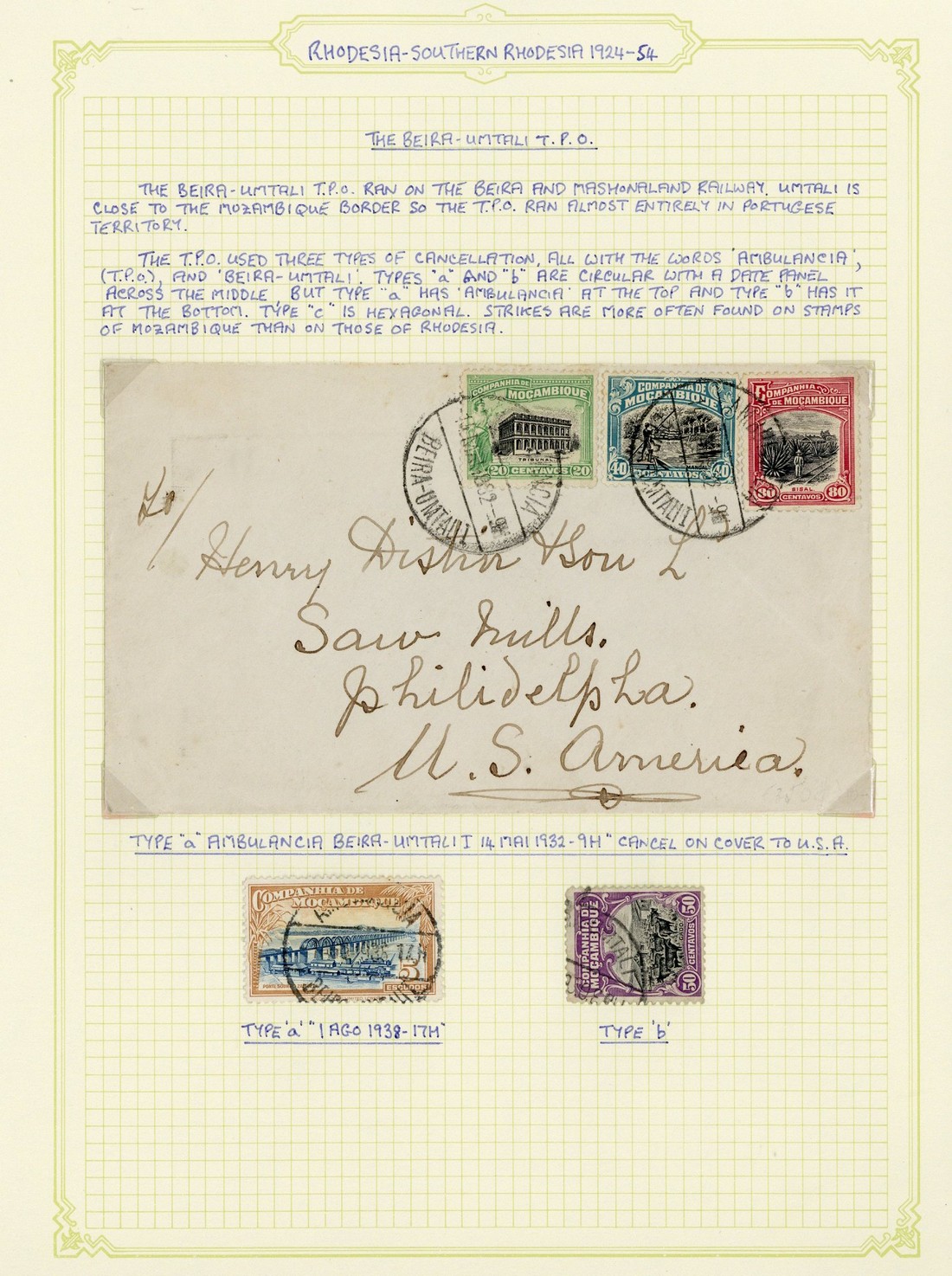 1912-21 T.P.O. selection, comprising "t.p.o. up/s. rhodesia" (30 items, dates as early as 10 March) with Double Head values to 3d. including 1d. block of six and Admiral values to 2/- (2), "t.p.o. down/s. rhodesia" (3) , and Beira-Umtali T.P.O. c.d.s. on 1932 envelope to U.S.A. and loose values (4). An interesting and unusual lot with several ex Birkhead