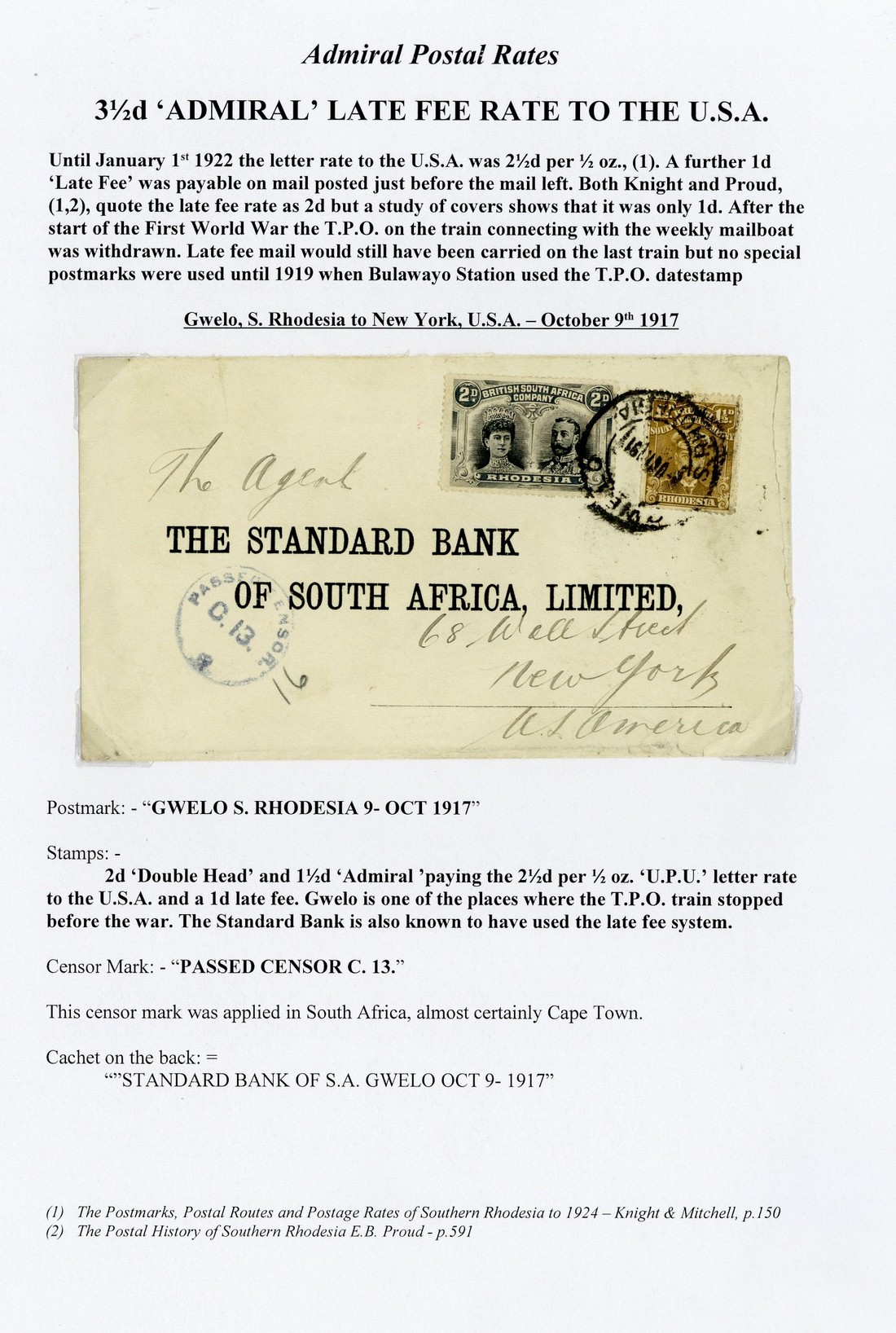 1914-19 Standard Bank envelopes (5) bearing Admiral values and comprising 1914 double rate from Bulawayo bearing Die I 5d., 1917 single rate with 1d. late fee bearing 1½d. in combination with Double Head 2d., 1917 triple rate from Umtali bearing 1½d. and 6d., 1918 single rate from Que Que underfranked at 1½d. though not charged postage due, and 1919 double rate from Salisbury with 1d. and 4d., all but the first with censor cachets