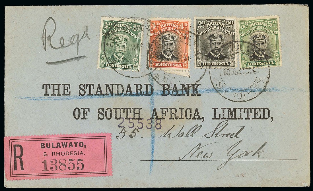 1914 (10 June) Standard Bank envelope registered from Bulawayo to New York, bearing Admiral ½d., 4d. Die I perf. 15, 5d. Die I perf. 14 and 2d. Die II perf. 15, all tied by Registered c.d.s. and with bright pink registration label at lower left; a scarce four-colour Admiral franking. Photo