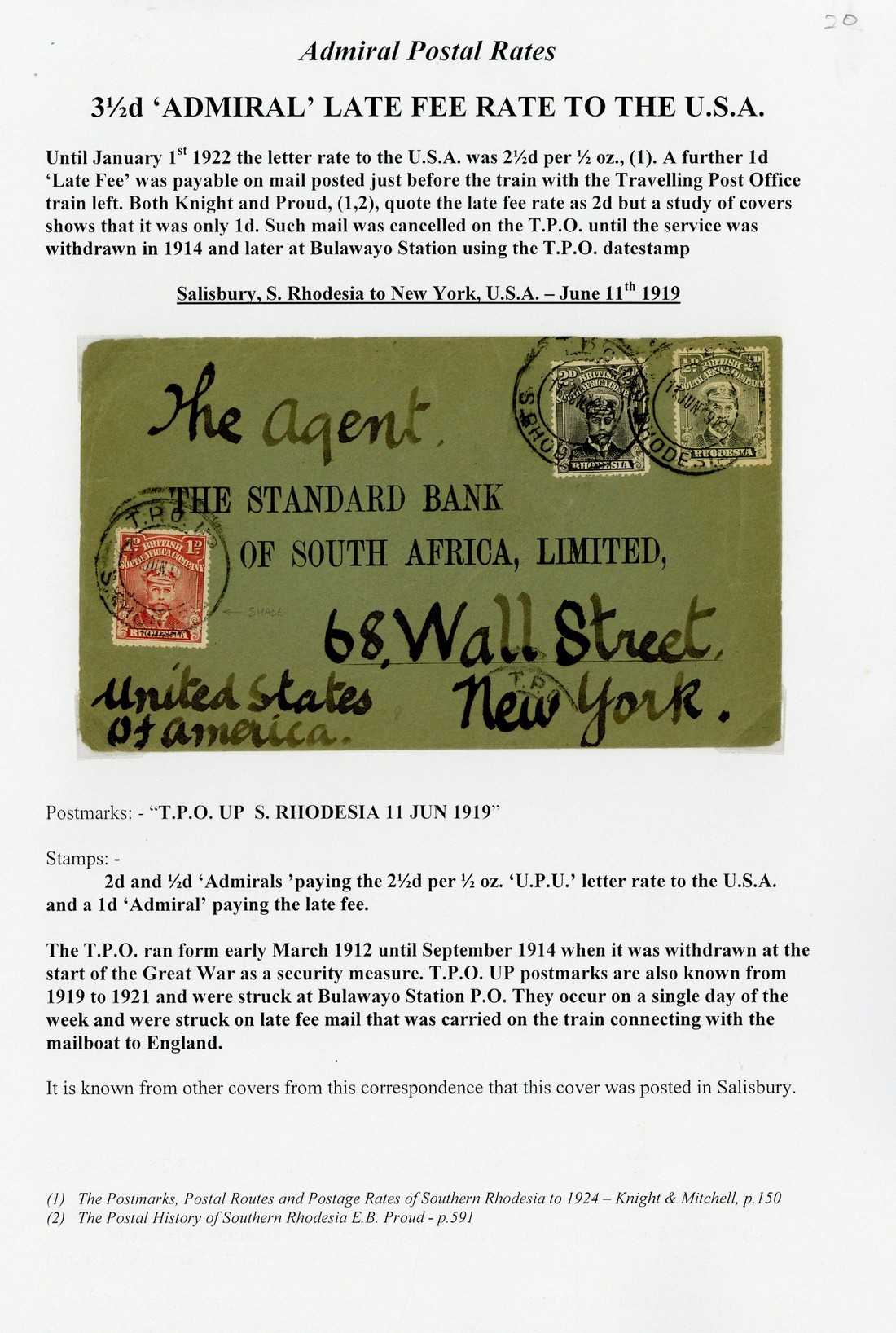 1914 (Sept.) envelope to England bearing Admiral 1d. pair sharing light "t.p.o. up" c.d.s. and 1919 Standard Bank envelope to New York bearing ½d., 1d. and 2d. each cancelled by fine "t.p.o. up" c.d.s; an attractive pair illustrating before and after war usage of this datestamp