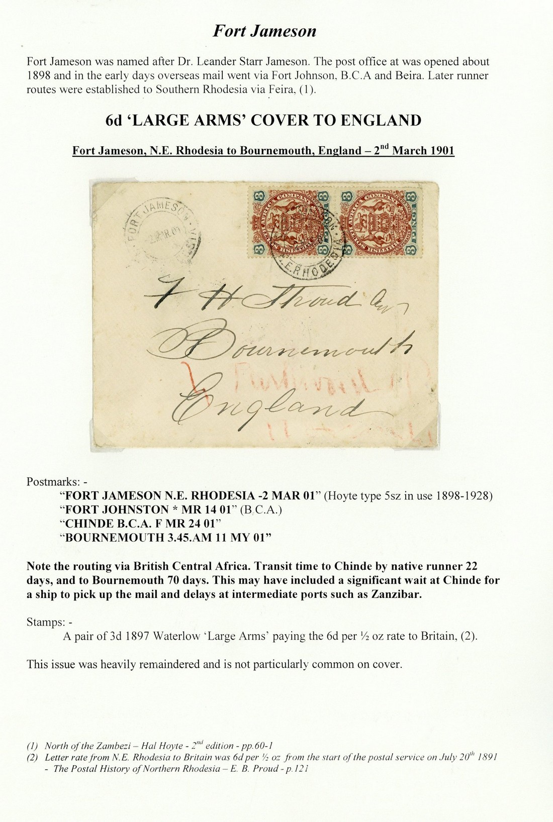 1895-1909 selection of covers (11), mainly to England and comprising items from Abercorn (one with "b.c.a." c.d.s.), Fort Jameson (2), Kalomo (2), Kansanshi, Mwomboshi, Mpika (2, one with additional stamp removed) and Pemba (complete with letter from a farmer regarding driving oxen down to Livingstone)