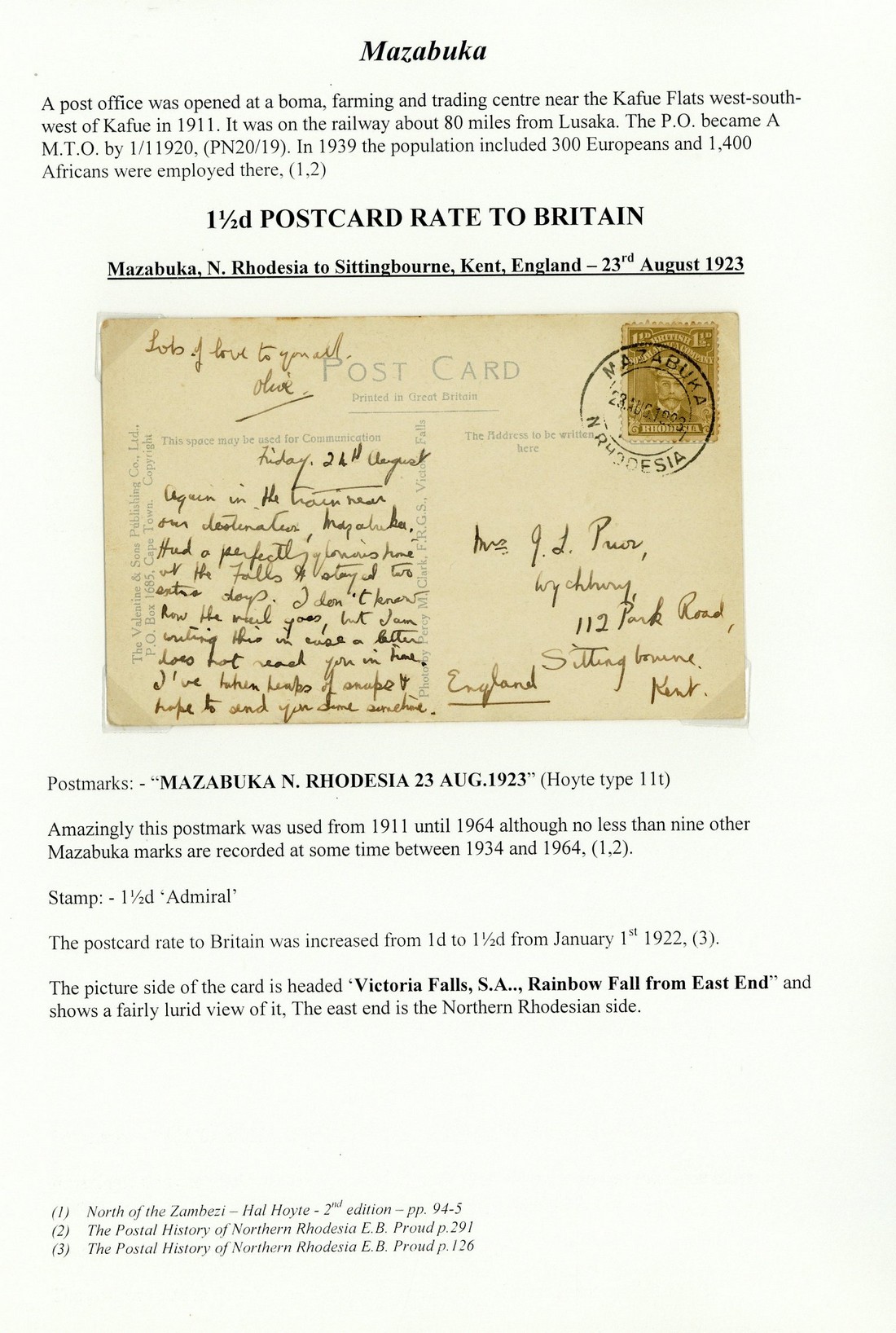 1914-23 selection of postcards (7) bearing Admiral values and comprising items to Belgium (3, all from Livingstone), England (3, two from Mazabuka) and Southern Rhodesia