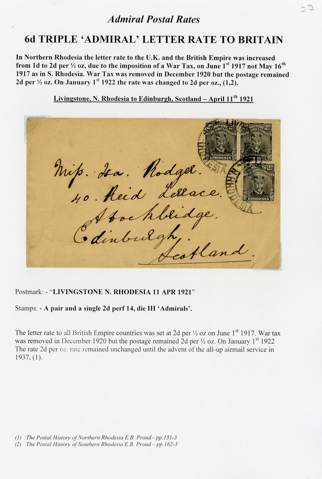 1917-24 envelopes (6) to England bearing Admiral values, six franked at 2d. (two bearing 1d. pairs) from Fort Jameson (on 4d. registered envelope), Kasama, Mongu-Lealui, Namwala, Ndola, and a triple rate bearing 2d. (3) from Livingstone