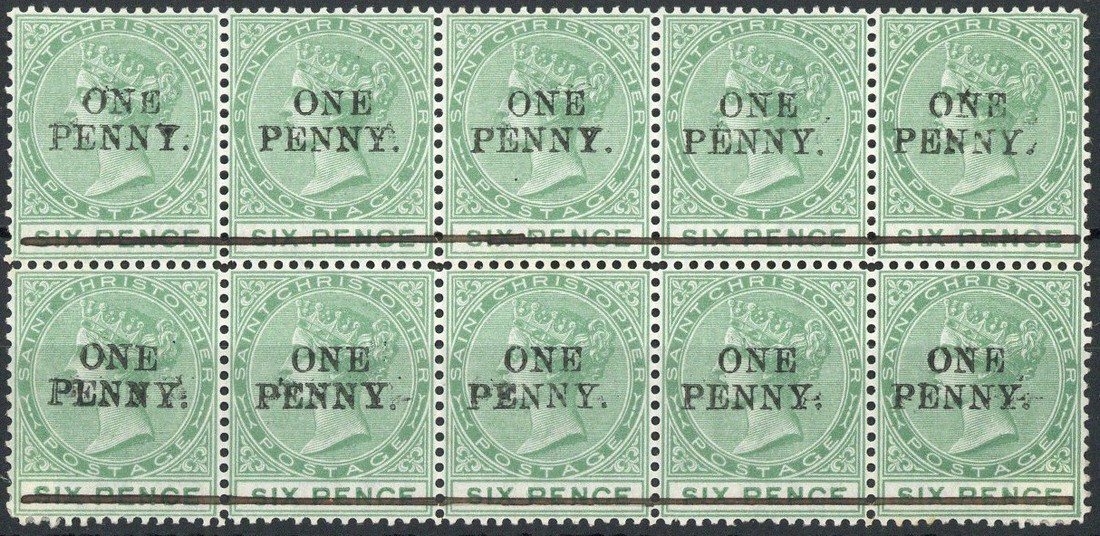 1886 (June) 1d. on 6d. green block of ten (5x2), [11-20], fresh with large part original gum, the centre block of six and one other remaining unmounted; fine. B.P.A. Certificate (1948). S.G. 24