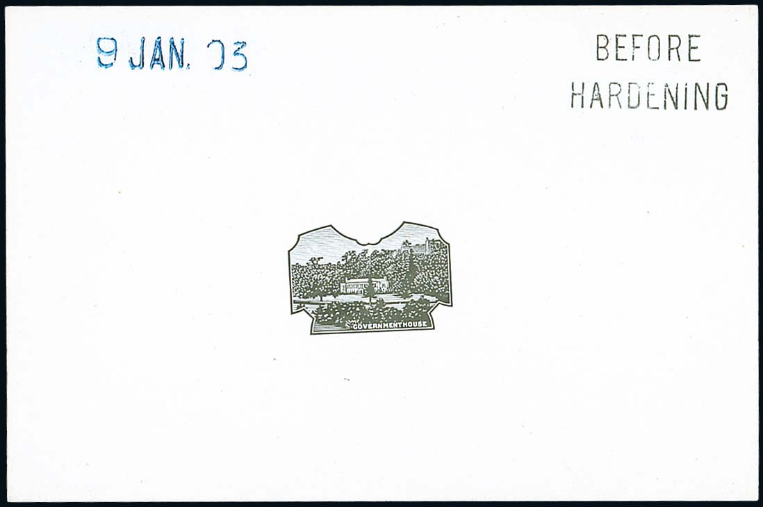 ½d./2d./1/- Government House vignette die proof in black on glazed card (92x60mm.), marked "before hardening" and dated "9 jan. 03". Photo