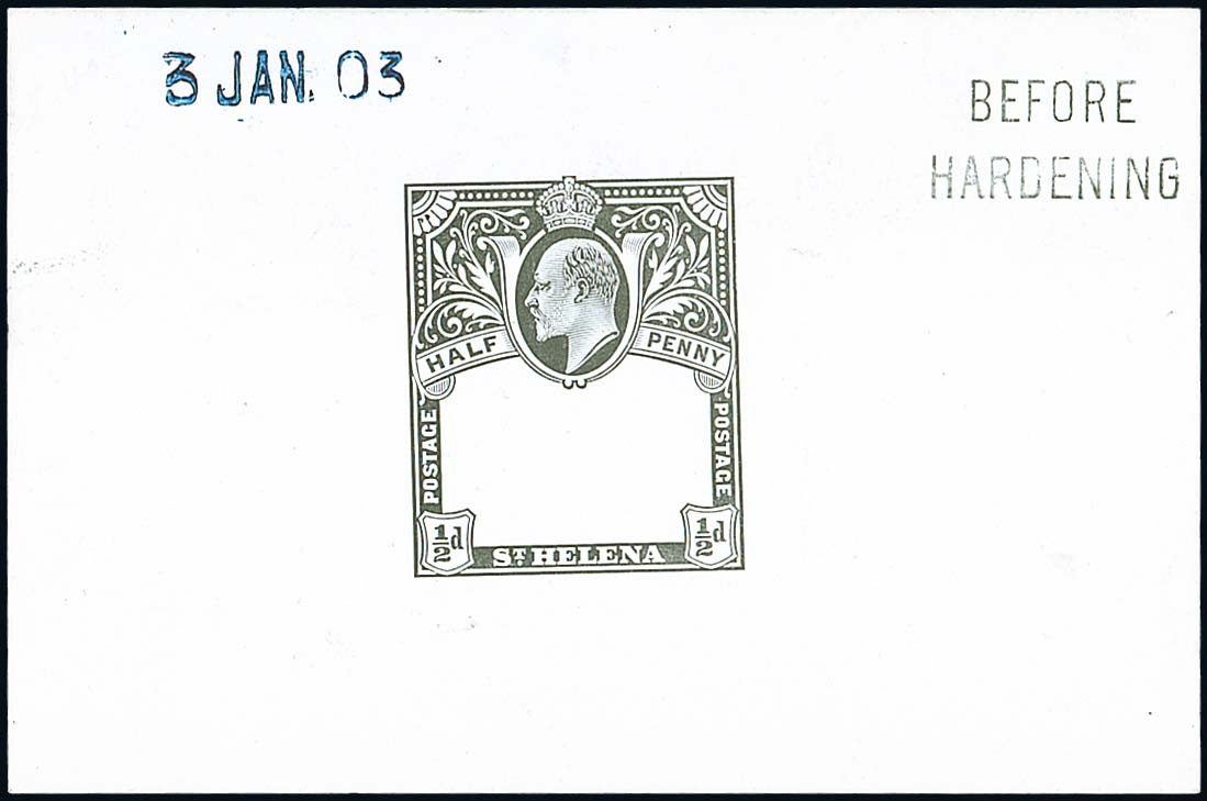 ½d. frame die proof in black on glazed card (92x60mm.), marked "before hardening" and dated "3 jan. 03"; very fine. Photo