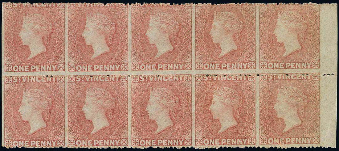 1861 no watermark, rough to intermediate perf. 14 to 16, 1d. rose-red marginal block of ten (5x2) from the right of the sheet, variety imperforate vertically, large part original gum; light diagonal crease affecting one block of four. A rare multiple of this variety. S.G. 1a. Photo