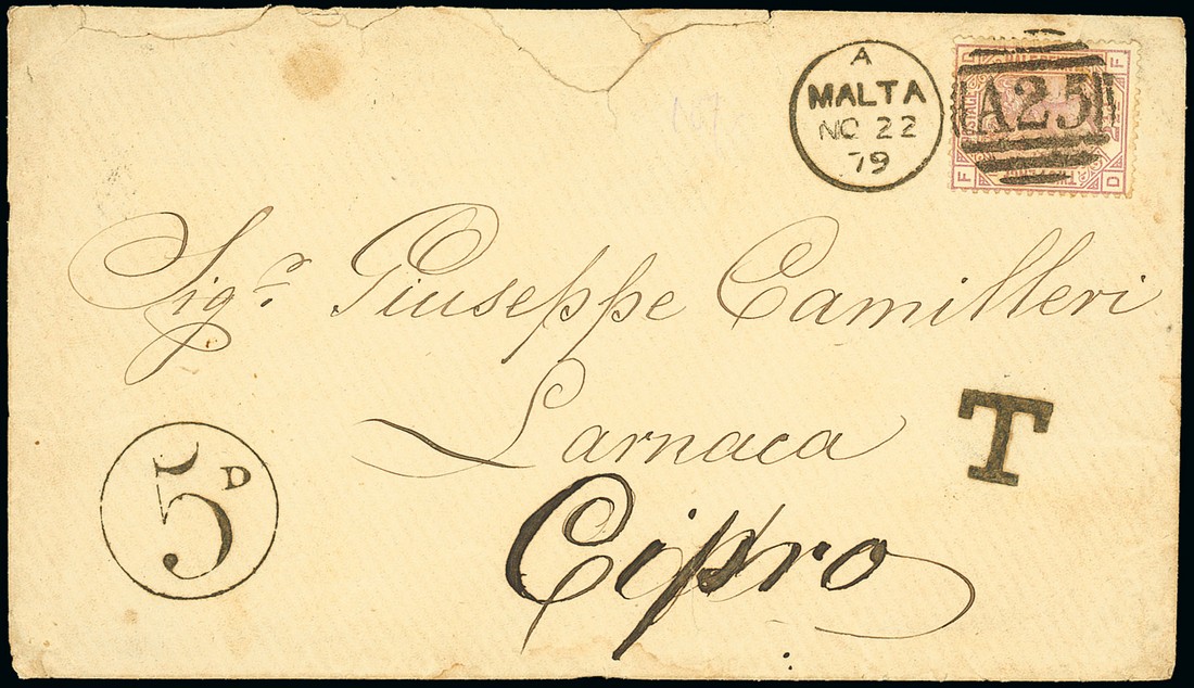 1879 (22 Nov.) envelope (minor imperfections) to Cyprus, bearing G.B. 2½d. rosy mauve cancelled by fine "A25" duplex and showing superb "T" and circular-framed "5d" (PD-52) handstamps, arrival c.d.s. on reverse. Photo