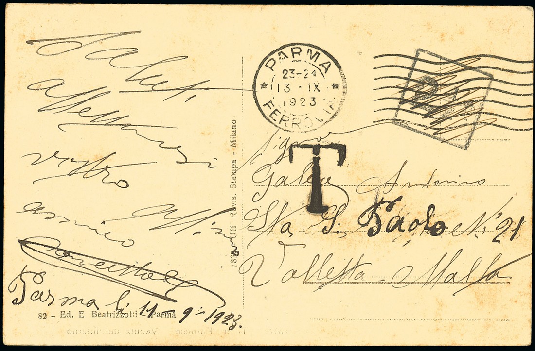 1923 (23 Sept.) postcard from Parma to Valletta, bearing 15c. (2) on picture side and showing, on address side, "T" handstamp and despatch machine datestamp over-cancelled by boxed "2½d" handstamp (PD 21/23) which has been crossed out by pen, probably when the adhesives were noticed on the other side. Photo