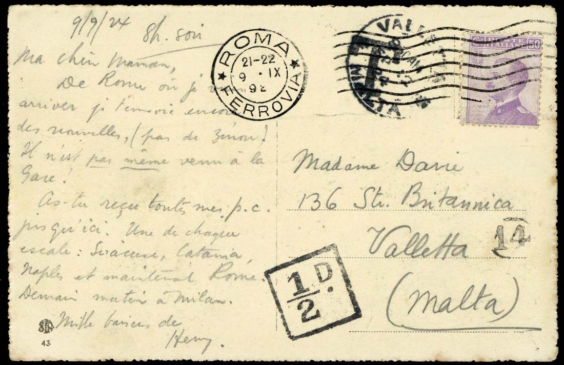 1924 (9 Sept.) postcard from Rome to Valletta, franked at 50l. and showing arrival c.d.s. (12.9) and "T" handstamp with superb boxed "½d" handstamp at foot