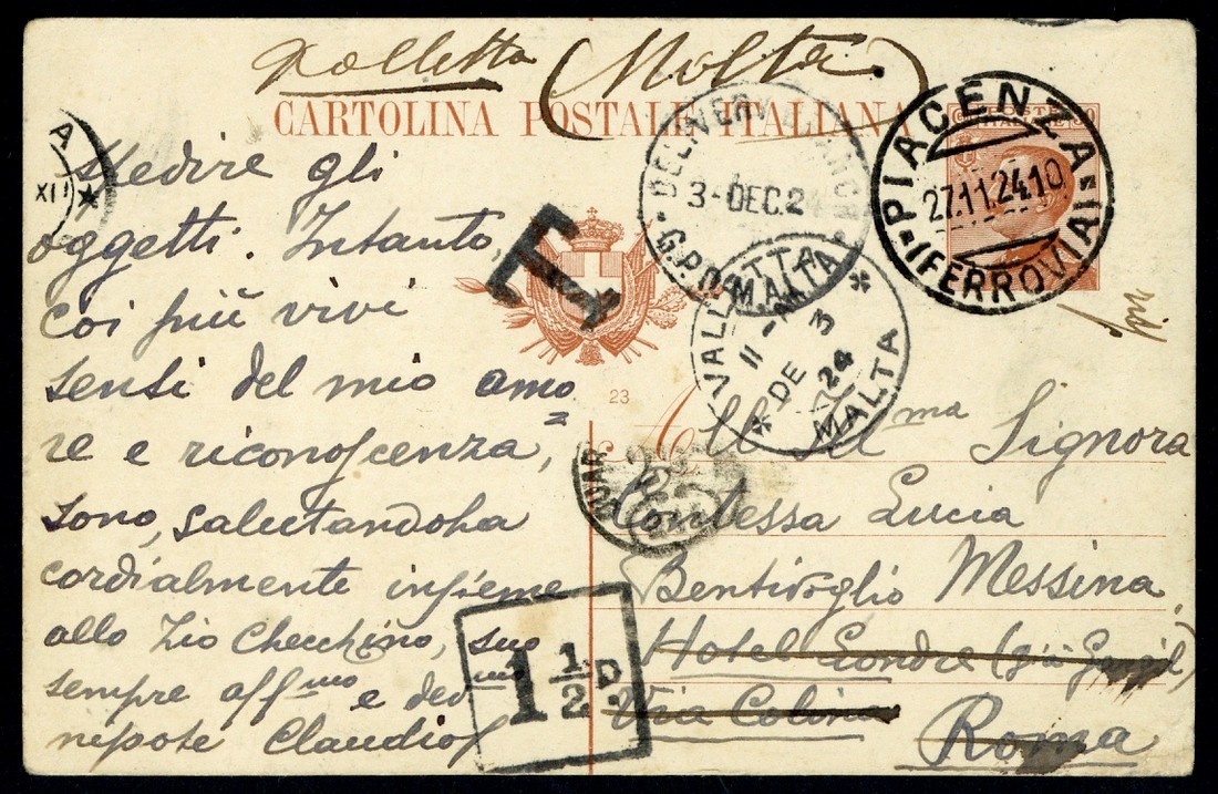 1924 (27 Nov.) Italian 30c. postcard from Piacenza to Rome an re-addressed to Valletta, showing transit datestamps, "T" and boxed "1½d" handstamps (PD 11/23) and arrival c.d.s. (3.12)