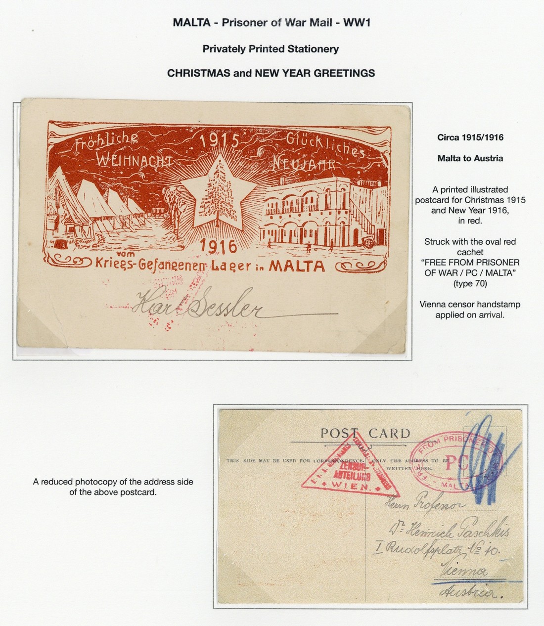 1915/16 privately printed Christmas and New Year Greetings card in red (POW-G1) to Austria, showing "free from prisoner of war/pc/malta" handstamp (POW-6) in red and Austrian censor cachet, also in red, and 1916 (24 Apr.) envelope from Egypt to Holland with Alexandria c.d.s. and large circular "post free/p.c./prisoner of war" cachet in red