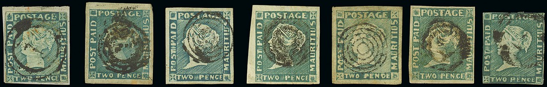 — 2d. intermediate to worn impressions including one showing "penoe" variety, a selection of shades and impressions (15), one on large piece showing framed "inland." and framed "Mahebourg" in blue, others cancelled "1" in blue and one with part framed "inland."; some with margins all round or nearly all round. Condition very mixed (one defective) as to be expected with a lot of this nature. Also a few forgeries and reprints including complete sheets of both values. Photo for a selection