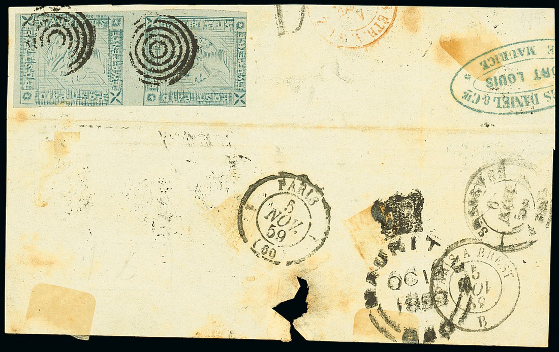 — worn impression 2d. on blued paper, vertical pair, the upper stamp with margins all round, the lower example touched or cut into at places, tied to piece by mute concentric circles cancellations, Mauritius G.P.O. c.d.s. of 12 Oct. 1859 and a variety of French transit datestamps on reverse. S.G. 39. Photo