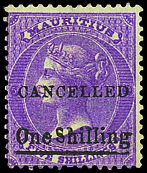 1877 1/- on 5/- bright mauve, variety wrong font "S", overprinted "cancelled" unused without gum, fine and scarce. S.G. 82a, var. Photo