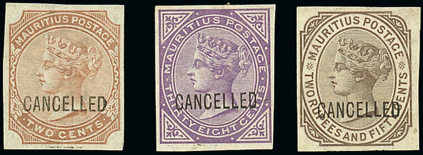 1879-80 CC 2c. Venetian red (light crease), 38c. bright violet and 2r.50 brown-purple imperforate plate proofs on watermarked paper, each handstamped "cancelled" (Type D4), all without gum, fine. S.G. 92, 98, 100. Photo