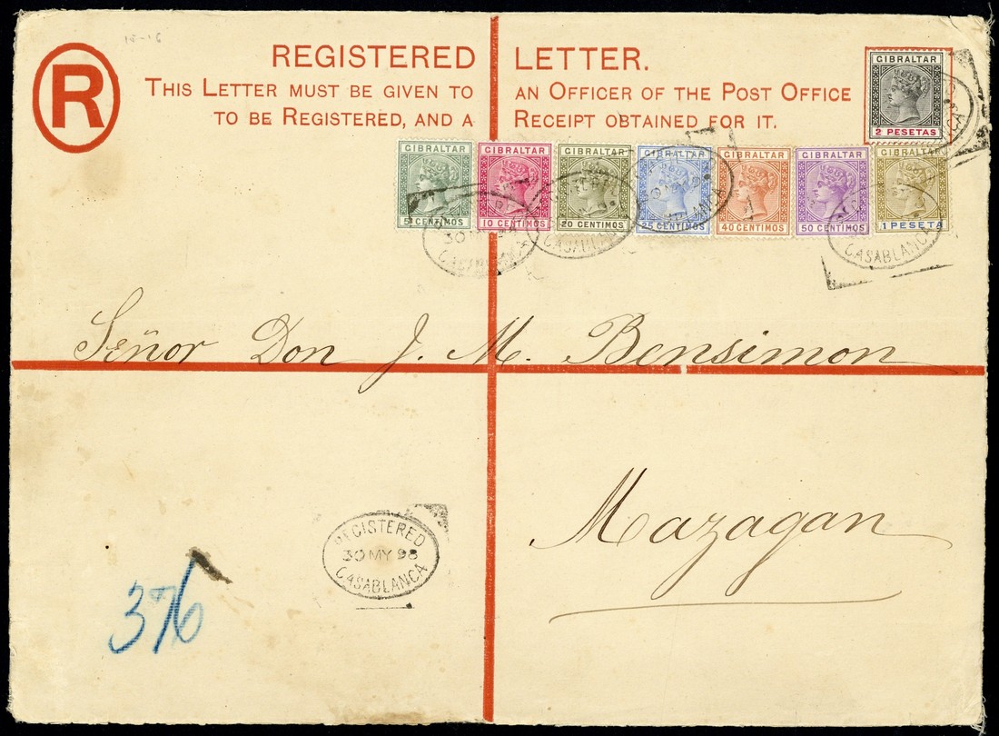 1898 (30 May) 20c. I size registered envelope to Mazagan, bearing 1889-96 5c., 10c., 20c. olive-green and brown, 25c., 40c., 50c., 1p. bistre and ultramarine and 2p. black and carmine all cancelled by oval registered datestamp with a further strike at foot. A rare envelope size used, particularly in Morocco