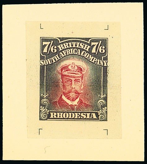 7/6d. in carmine and black with printer's guide marks at all four corners, with design lightly scored through horizontally at centre, on wove paper (26x31mm.) affixed to piece of card (39x47mm.). Superb. P.F.S.A. Certificate (1969). Photo