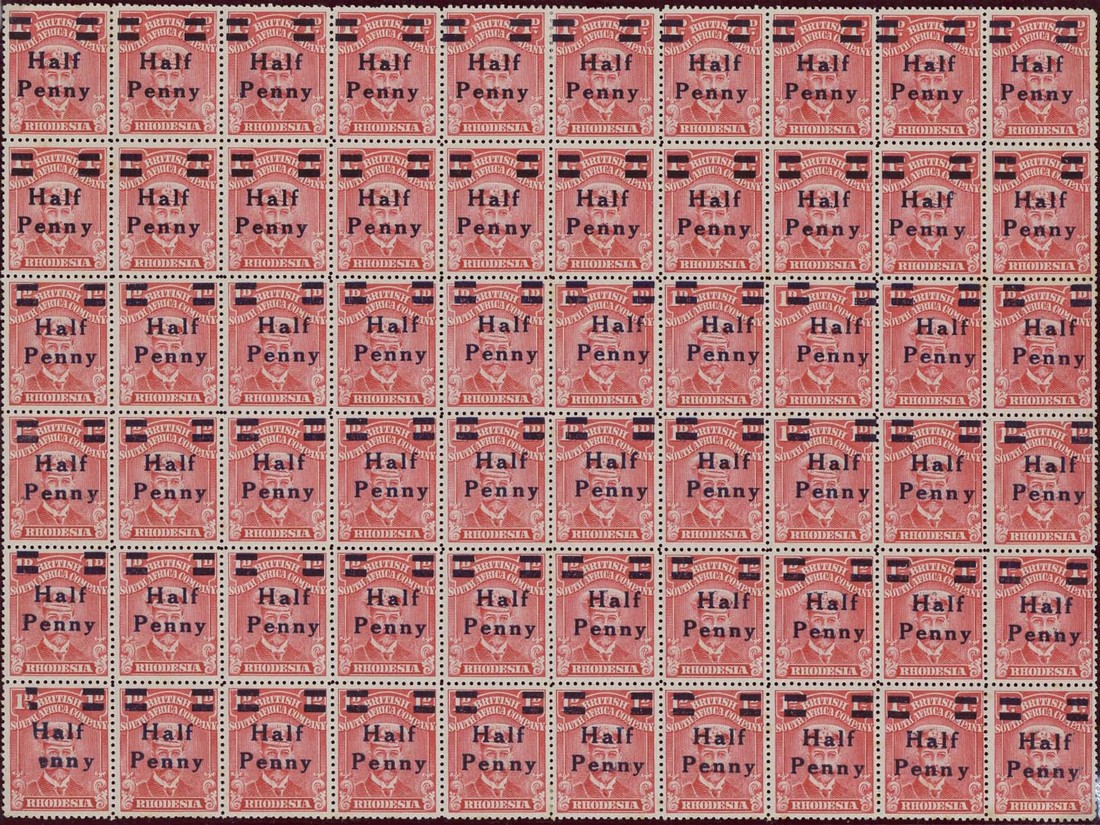 "Half/Penny" complete pane of sixty (10x6), [51] showing "P" of "Penny" and part of the left-hand bars, "H" and "e" failing to print, fine mint with most remaining unmounted. Most unusual. S.G. 280, b, c