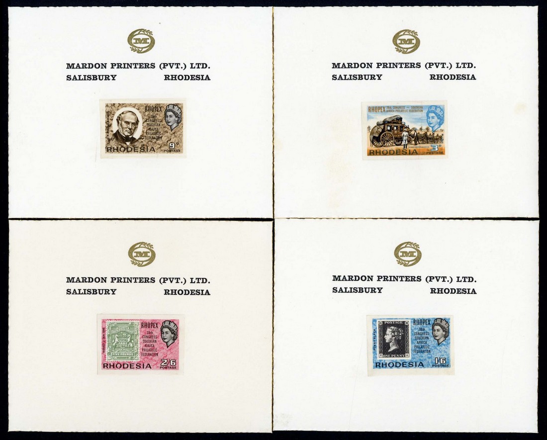 3d., 9d., 1/6d. and 2/6d. imperforate proofs in issued colours, each affixed to deckle-edged Margin Ltd. presentation card; fine