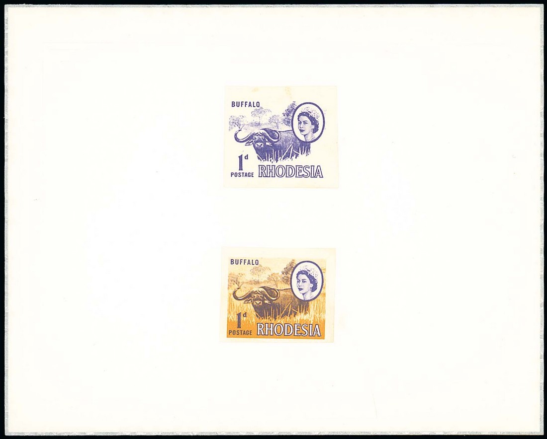 1d. imperforate proofs (2), one of reddish violet only, the other of both colours, affixed to fancy-edged presentation card. Rare. Photo