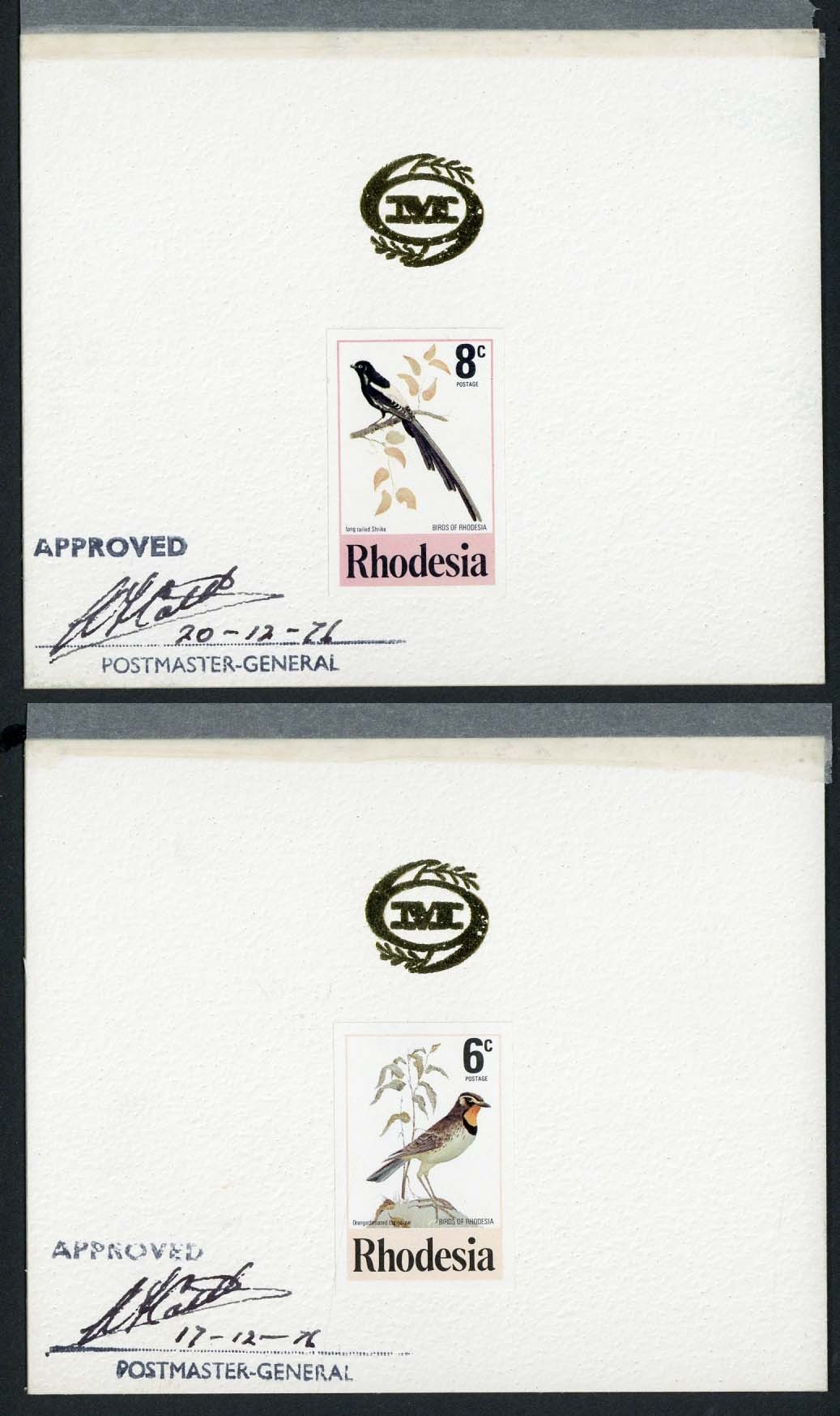1977 Birds 6c. and 8c. imperforate proofs , both affixed to cards signed as approved by the Postmaster-General and mounted in Mardon presentation folders