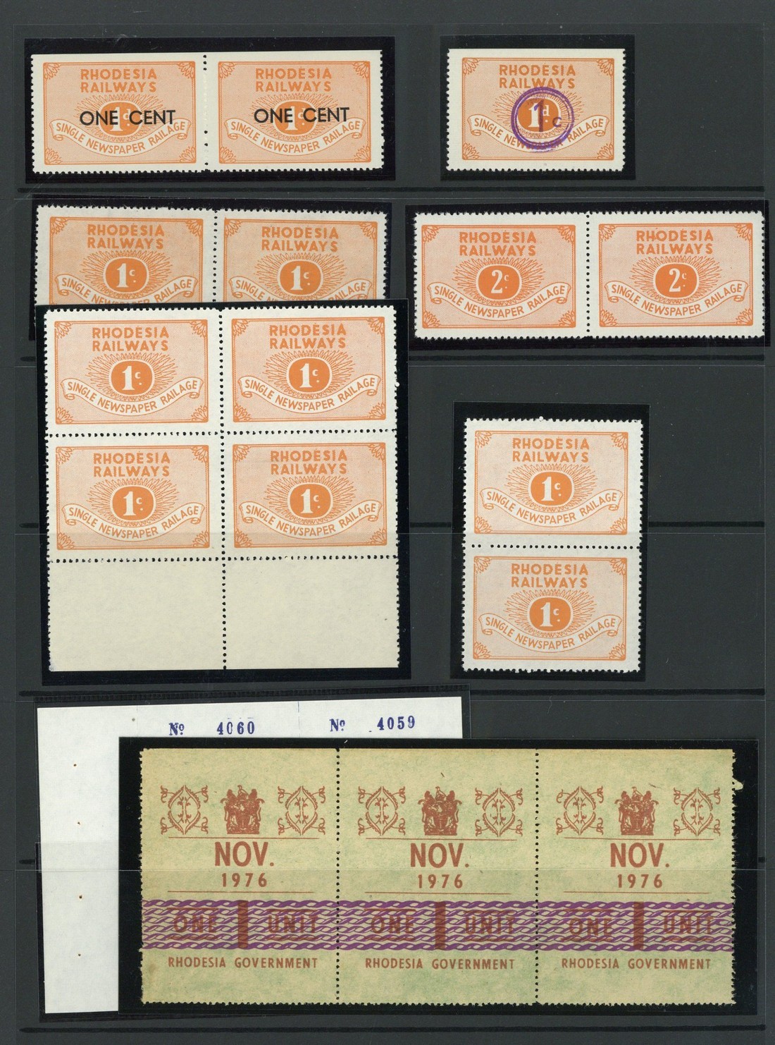 1966 1c. on 1d. imperforate top margin pair, 1970 handstamped 1c. in violet on 1d. with imperforate top margin, 1971 1c. marginal block of four and a vertical pair (missing perf. between), 1973 1c. pair and 1976 2c. pair, mint or unmounted mint. Also 1968 3/6d. Air Letter Service label pair and 1976 (Nov.) 1 Unit Petrol Ration Coupon strip of three