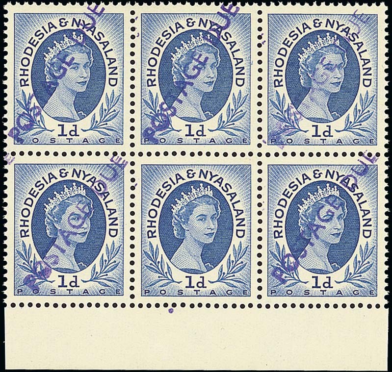1959 1d. blue handstamped "postage due" diagonally in violet, a marginal block of six from the foot of the sheet, [43-55], the centre stamp in the lower row variety "postage due" omitted, fresh unmounted mint. Exceptionally rare with only two such missing handstamps recorded. B.P.A. Certificate (2011). Photo