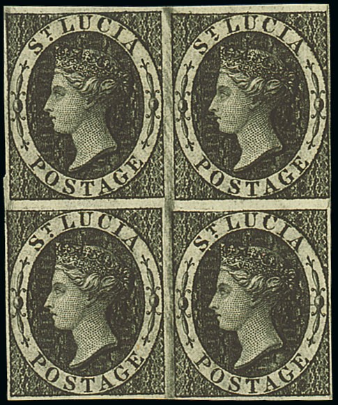1864 CC perf 12½, (1d.) intense black imperforate block of four, cut close at right, fine with large part original gum. S.G. 11var. Photo