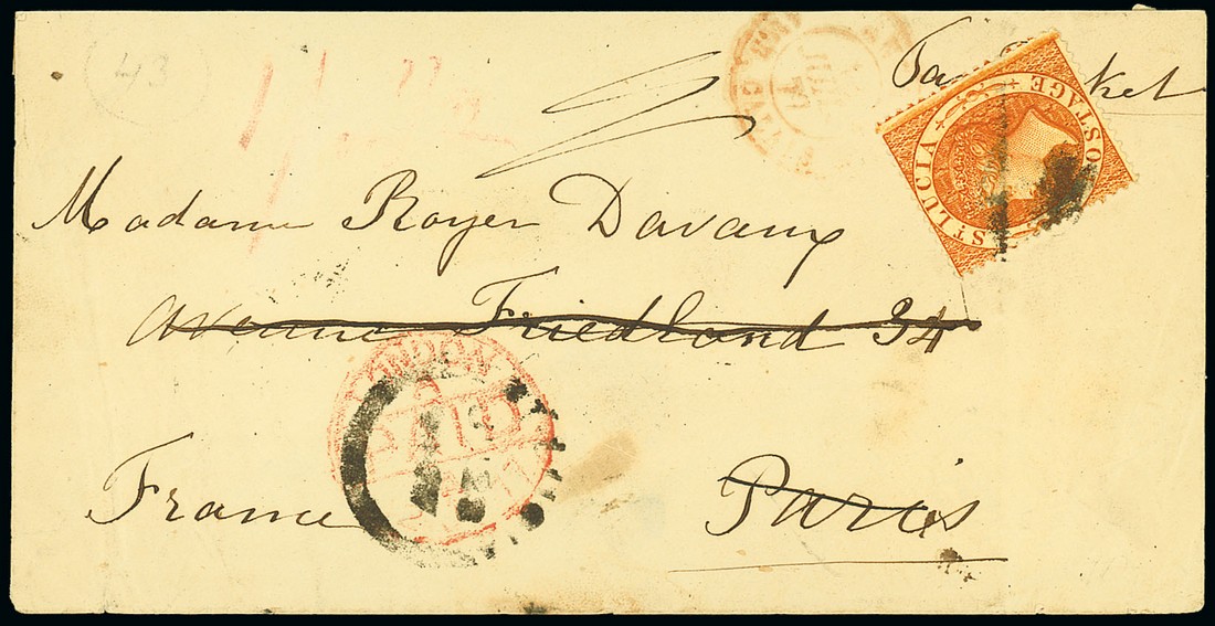 1877 (28 June) entire to Paris and redirected locally, bearing 1876 (1/-) orange indistinctly cancelled, showing red crayon "1/0½", despatch d.s. overstruck by red London Paid transit d.s., red Calais entry d.s. and, on reverse, various transit and arrival datestamps; the odd minor stain otherwise fine. S.G. 18. Photo