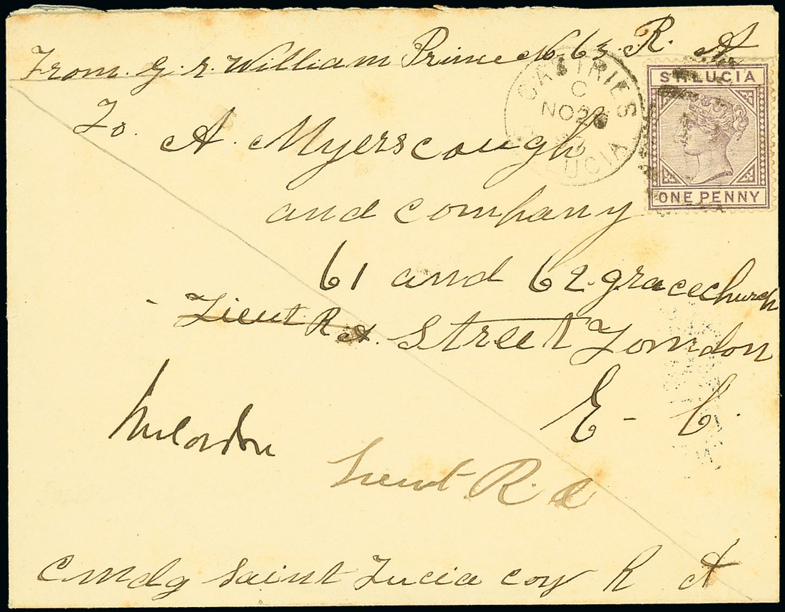 1897 (20 Nov.) soldier's envelope to London, headed "From G.R. William Prince 663 R.A.", countersigned by Commanding Officer, bearing 1891 1d. dull mauve tied by Castries duplex and showing arrival d.s. on reverse; some light tone spots. Photo