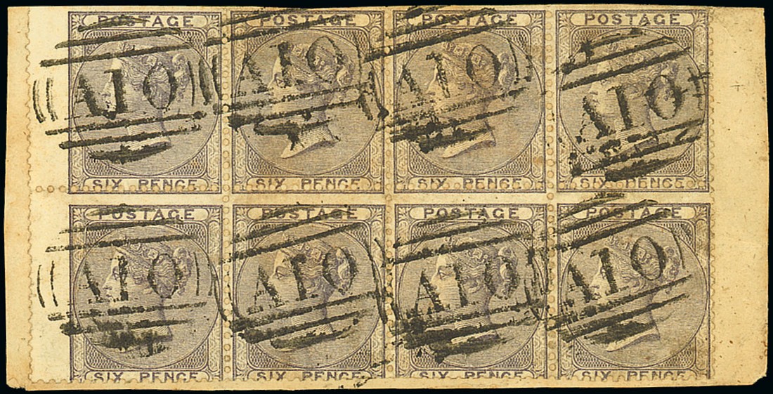 6d. lilac, a block of eight (4x2) on small piece, each centrally cancelled "A10"; some perforations trimmed and a little soiled, nevertheless a rare and remarkable multiple. S.G. Z4, £2400+. Photo