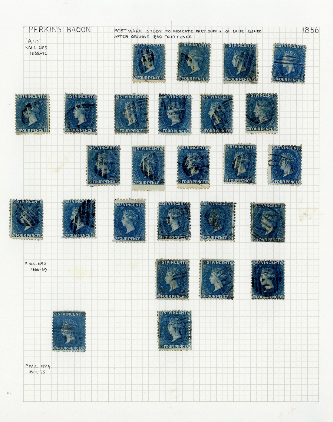 — 4d. deep blue used range comprising pairs (5, one on large piece, one with light crease) and singles (40), some shade variation, all cancelled "A10" (different types with one additionally cancelled "k" in red; condition rather mixed. S.G. 6, £5500