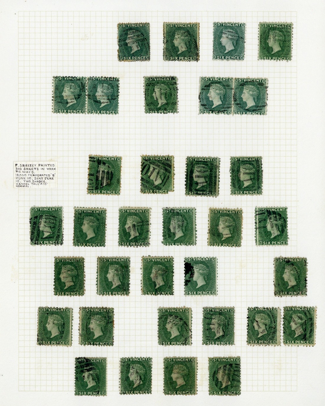 — 6d. deep green used range comprising pairs (3, one on small piece) and singles (50, one on 1871 front to St. Lucia - faults), some shade variation, condition very mixed. S.G. 7, £4200