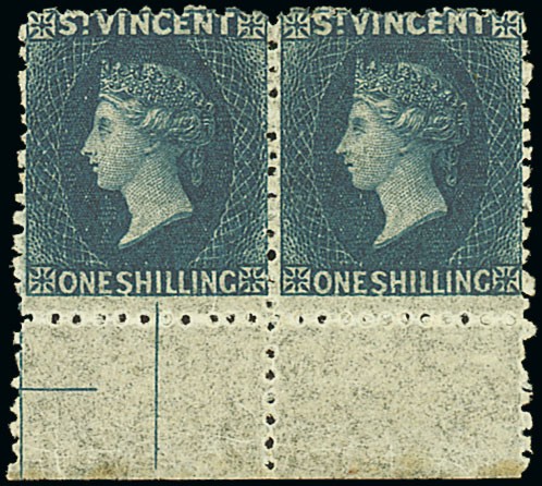 — 1/- indigo, a horizontal pair with sheet margin at foot showing guide lines, unused with large part original gum, lovely deep colour, light gum crease, fine. S.G. 13, £750. Photo
